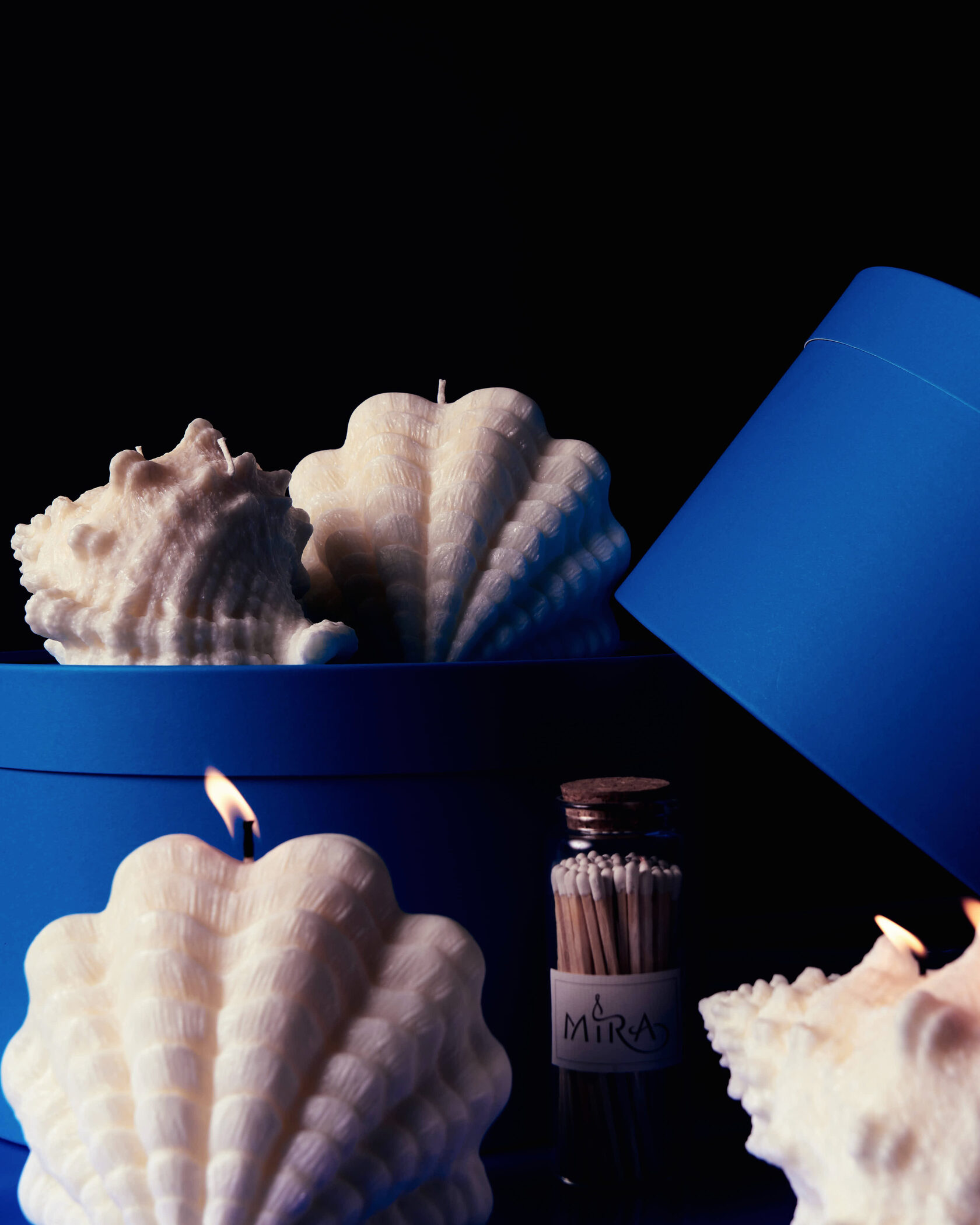 В состав набора входит: 2 большие свечи ракушки, маленькие спички, подарочная упаковка.